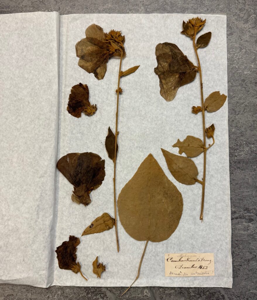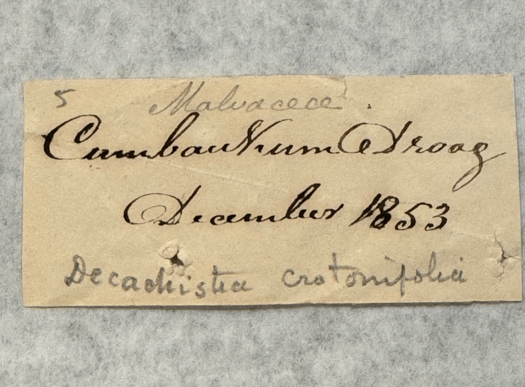 The most interesting specimen in the collection turned out to be a syntype. Identified by Cleghorn as Decaschistia crotonifolia examination of its indumentum and epicalyx segments showed it to be D. rufa, a species described only sixty years after the collection was made – a relative of hibiscus, a large herb, with stems and leaves covered in rusty indumentum. From the dried flowers I guessed that in life they had been dark red but it turns out that, like several other Malvaceae (including okra and some cottons), the flowers in vivo are lemon yellow with a dark purple basal spot, and turn wine red as they age. The species was described in the Kew Bulletin for 1912 by William Grant Craib (1882–1933) while an assistant in the Kew herbarium, but with Indian interests having previously worked as Acting Curator of the Calcutta herbarium. I feel a particular closeness to Craib, as after he became Regius Professor of Botany at Aberdeen in 1920 he taught my father.
