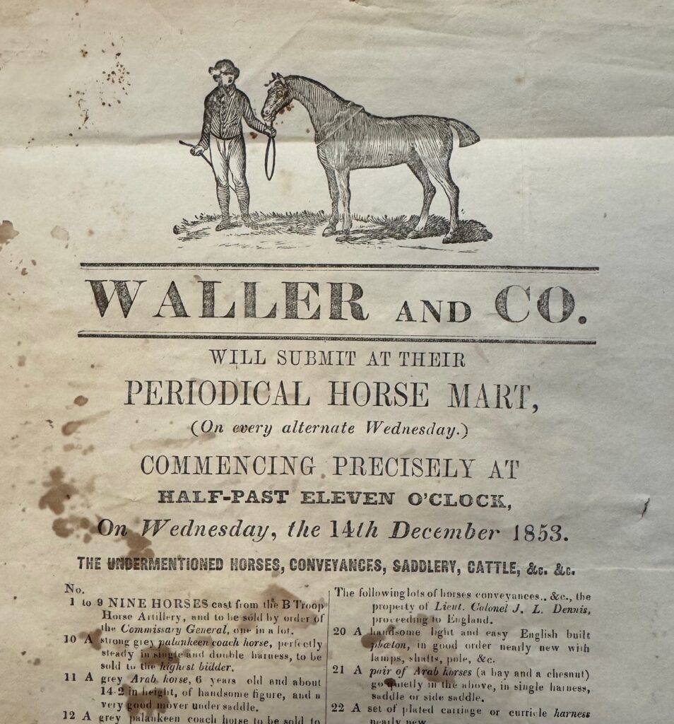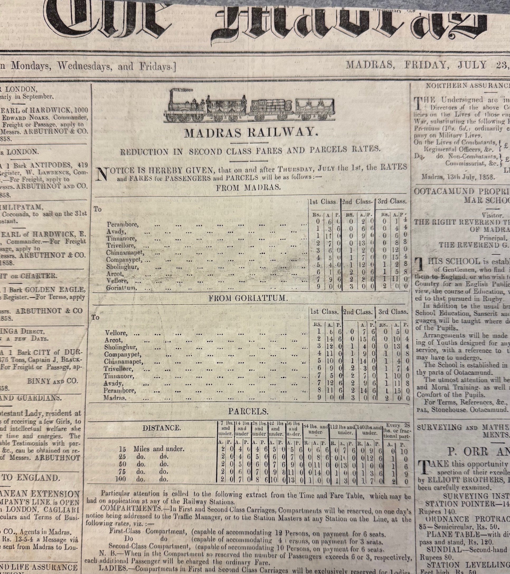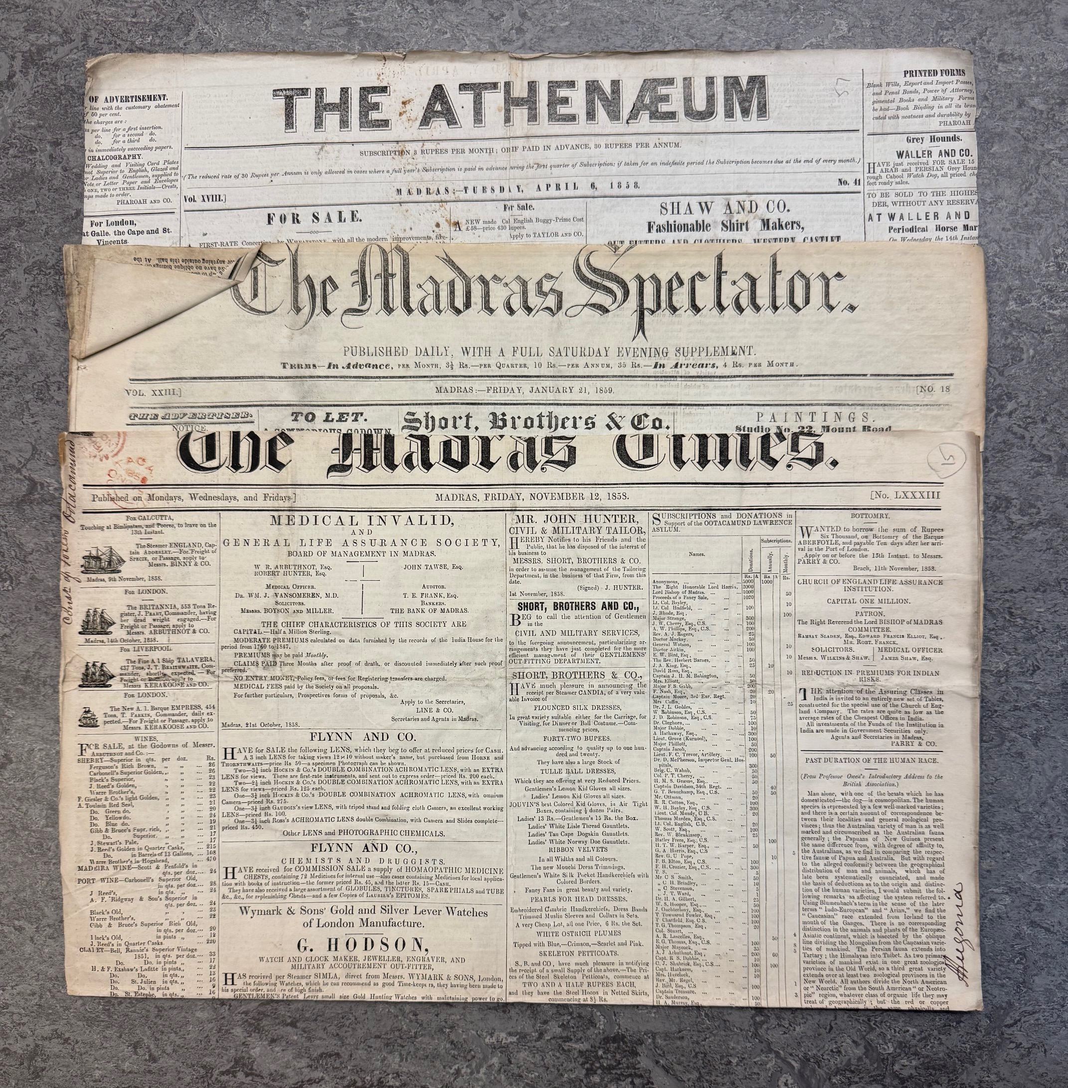 The newspapers are of considerable interest, assuming that they were subscribed to by Cleghorn, rather than bought as scrap paper. Two certainly were his as they are inscribed with his name, title, and address while on tour as Conservator of Forests in Salem and Ooty. These tell us something about his reading habits and suggest a great thirst for news both Indian and from Britain. Also used was also a pamphlet advertising a Madras ‘Periodical Horse Mart’ revealing a previously unknown, though unsurprising, interest in horse flesh; and proof that he subscribed to the Gardeners’ Chronicle, suspected but previously unproven. Of the Indian newspapers was one published in Bangalore (The Bangalore Herald) and seven in Madras (Madras Circulator, The Commercial Gazette, United Service Gazette, The Athenaeum, The Madras Times, The Madras Spectator and the official government Fort St George Gazette). Of those published in Britain the largest number of sheets are from The Overland Mail, with smaller numbers from four others (The Indian News, The Morning Herald, The Record and The Examiner). There is also a single half-sheet from an unidentified Fife newspaper to show that he kept up with news from Scotland.