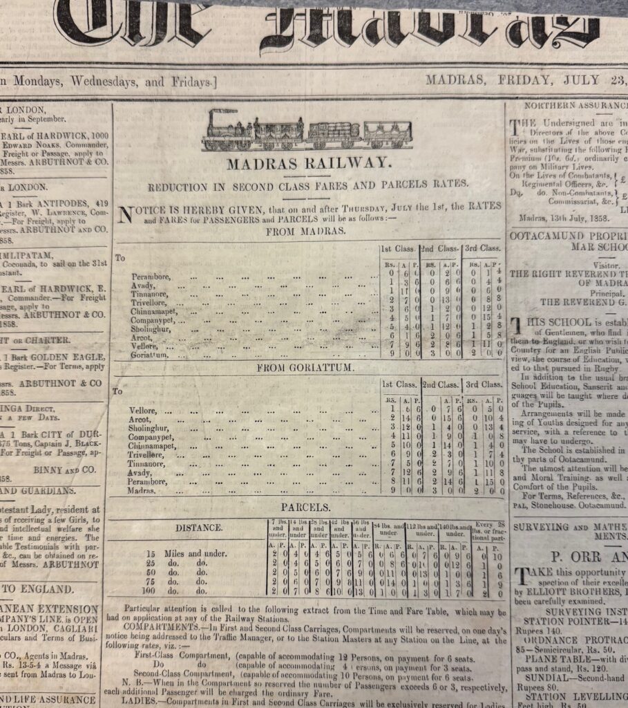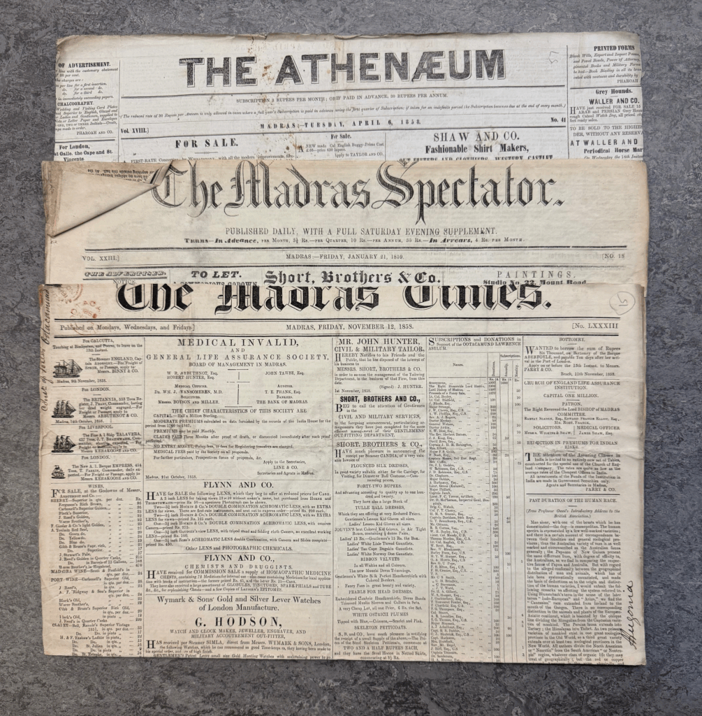 The articles in the papers dating from 1858/9 are of particular interest, with many articles discussing the aftermath of the Indian Mutiny. Interesting though the ‘news’ items are, the papers are equally intriguing for the advertisements and aspects of social history revealed. It would be easy to get bogged down, so here are only a few items that caught my eye while cataloguing: a meeting of the Madras Photographic Society attended by Sir Walter Elliot (6 April 1858); the opening of the organ by William Hill in St George’s Cathedral (13 September 1858); stained glass fanlights for the cathedral designed by Archibald Cole, Professor Fine Arts in the Madras School of Industrial Art, made by Nathaniel Wood Lavers of London (later Lavers, Barraud & Westlake) (21 January 1859); an advertisement by J. Deschamps offering three pianos by Erard (1 mahogany grand of 7 octaves; 1 mahogany grand square of 6¾ octaves; 1 rosewood cottage of 6¾ octaves) and 1 mahogany grand square by Broadwood (May 1854); J.J. Fonceca & Co offering ‘Likenesses either in Oil, Water Colors, or Crayon … Landscape and Cattle Drawings … charges so regulated with a view to place their services within reach of all (21 January 1859); an auction by Oakes, Partridge and Co. offered a by then very old fashioned ‘square piano by T. Tomkison, in good order’ (6 July 1853).