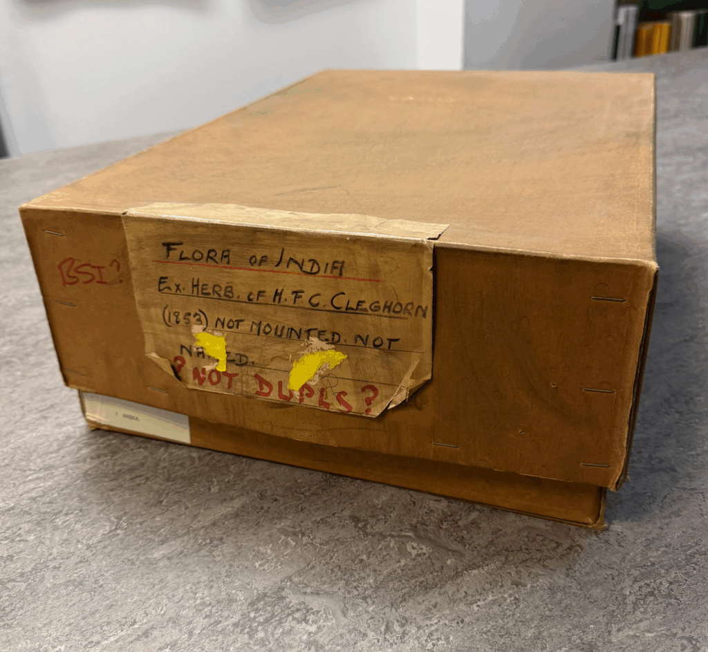 In September 2024 Lesley Scott exhumed a slightly sinister box from the RBGE Long Store. It contained a bundle of unmounted specimens and was labelled: “Flora of India. Ex Herb H.F. C. Cleghorn (1853). Not Mounted. Not Named. ?Not Dupls?“.