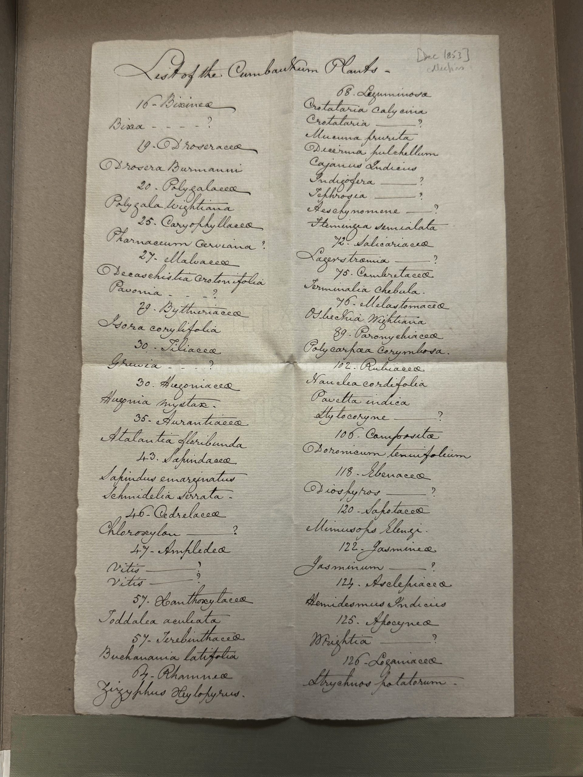 With the specimens is a two-sided ‘List of Cumbaukum Plants’, with 74 names in family order, including the unmounted specimens and those already in the RBGE herbarium – clearly a listing of the collection made in December 1853. As the paper on which it is written is watermarked 1856, it was probably written when Cleghorn or his clerk put them into their newspaper flimsies in 1858/9.