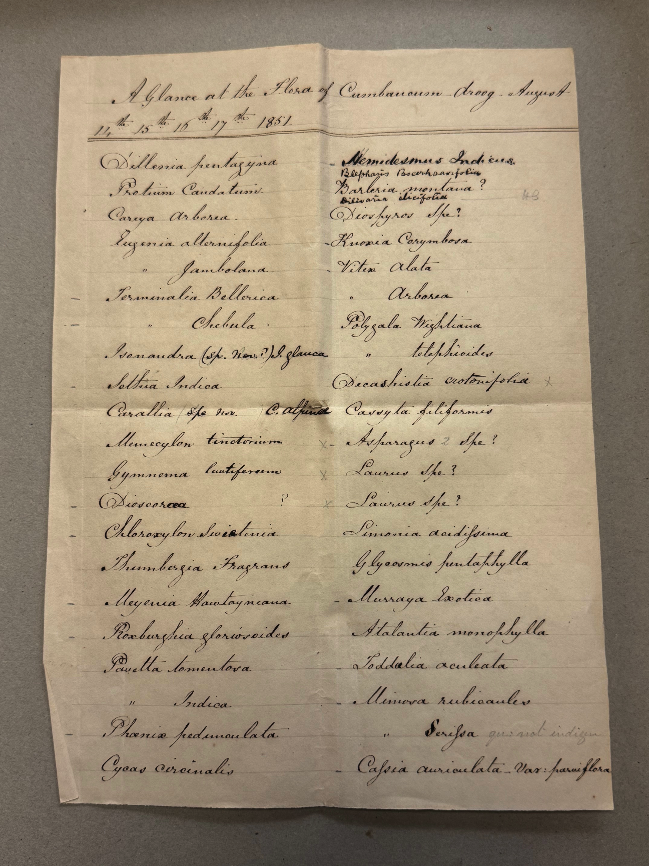 Also with the specimens is a four-page list titled ‘A Glance at the Flora of Cumbaucum droog – August 14th, 15th, 16th, 17th 1851’, in the same hand. This is puzzling as in August 1851 Cleghorn was on leave in Britain, so the list and the visit to which it refers cannot have been made by him. Cleghorn reached Madras in December 1851 and it was only early the following year that he was made Professor of Botany at the Madras Medical College, with access to assistants. Before going on leave to Britain in 1848 he had been in Mysore, where he was not known to have had a botanical establishment other than an un-named ‘Marathi’ artist. But perhaps he had trained an assistant who had left no previous trace and continued botanical work while Cleghorn was in Britain. Was it such a person who went to Cumbaukum Droog in 1851 and realised that it was worth a second look after Cleghorn’s return? From the plant names it was clearly made by someone with considerable botanical knowledge and seems unlikely to have been an East India Company employee or missionary based in the area. Cumbaukum was decidedly off the beaten track, though close to the great pilgrimage town of Tirupathi and the textile one of Sri Kalahasti.
