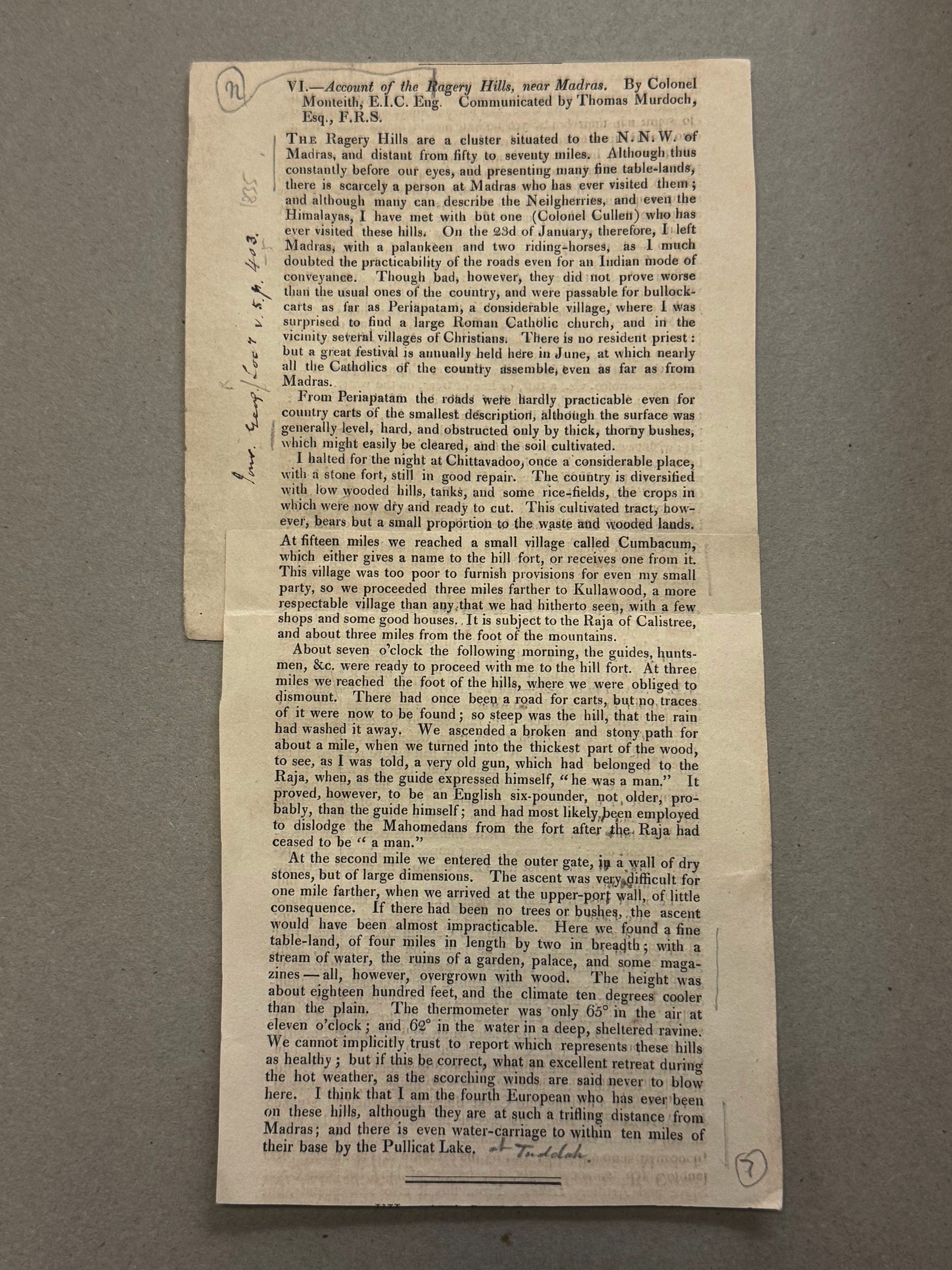 Also in the box was a cutting, made by Cleghorn, from the 1835 volume of the Journal of the Royal Geographical Society: an article titled an ‘Account of the Ragery Hills, near Madras’ by a Colonel Monteith. The title is misleading due to a misprint, but Cleghorn corrected the initial ‘R’ to ‘N’ as the article refers to the Nagari (now Nagalpuram) Hills. It was characteristic of Cleghorn to accumulate and annotate such cuttings on topics or plants of interest, but it cannot be known when he first saw the article (written six years before he first reached India), or how he came to realise that the locality might be worthy of botanical investigation.