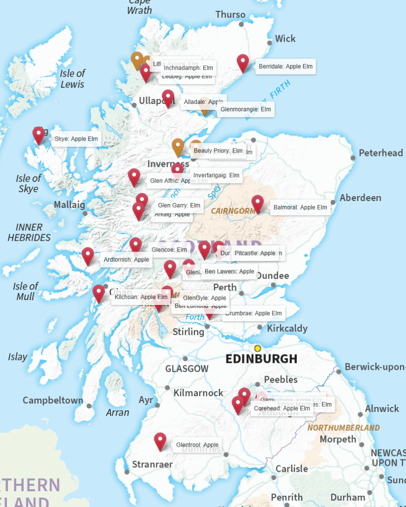 Also, five sites (marked in orange on the map) – Little Assynt Tree Nursery (1 elm), Beauly Priory (1 elm), Inchnadamph (9 elms), UHI campus (5 elms, 5 apples) and Glenmorangie distillery (10 elms) – had a few trees as ‘special’ plantings. Further elms have been sent to key partners: John Innes Centre will be testing 30 elms for disease resilience by artificial inoculation with Dutch elm disease and ten of our elms will be added to the largest UK collection of elm species in a private arboretum in Lincolnshire.