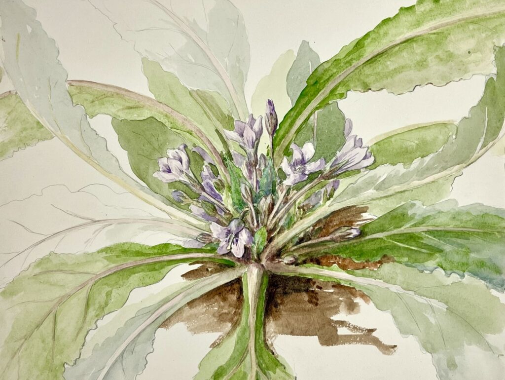 Haig’s interest in certain flora can also be observed through the scale in some of her works, such as in her painting Mandragora officinarum L.. While this work has an element of the impressionistic paint-application that is seen in a majority of her field sketches, the piece is significantly larger in scale and it is more dynamic in composition. The painting also includes a descriptive note on the verso, which expresses her fascination with this particular species: ‘There seems to be no folk-lore connected with it in Cyprus, though it is still valued in the Western Mediterranean, the dried root being worn as an amulet against barrenness in women.’