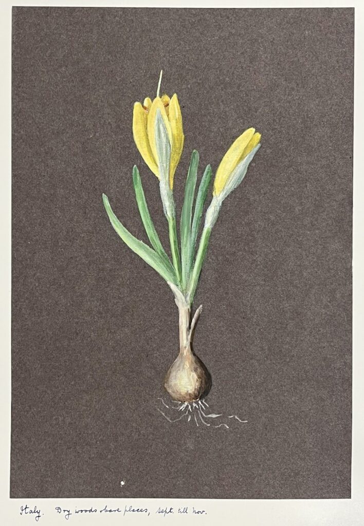 Haig’s works mostly depict plant species that she observed on her travels throughout the Mediterranean, specifically within Italy, Cyprus, Greece, and Malta. Her annotations keep track of where she ventured, during which months she travelled, and where she found specific plants. These locations include meadows, roadsides, the Boboli Gardens, ‘behind [a] Roman theatre,’ or in ‘parks of grand ducal villas,’ among others. On the backs of her paintings she often notes which months certain species of flora are likely to grow, and where they are most plentiful.