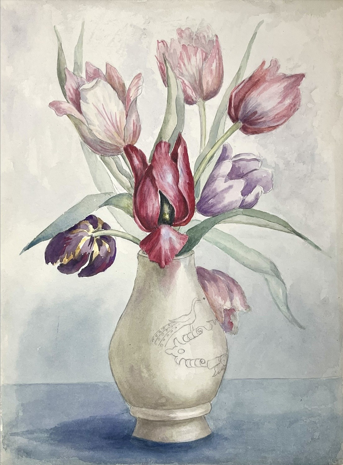 Left – Untitled [Calla Lilies], Circa 1902–1938, Watercolour and pencil on paper, RBGE; Right – Untitled [Pink and purple tulips in porcelain vase], Circa 1902–1938, Watercolour and pencil on paper, RBGE.