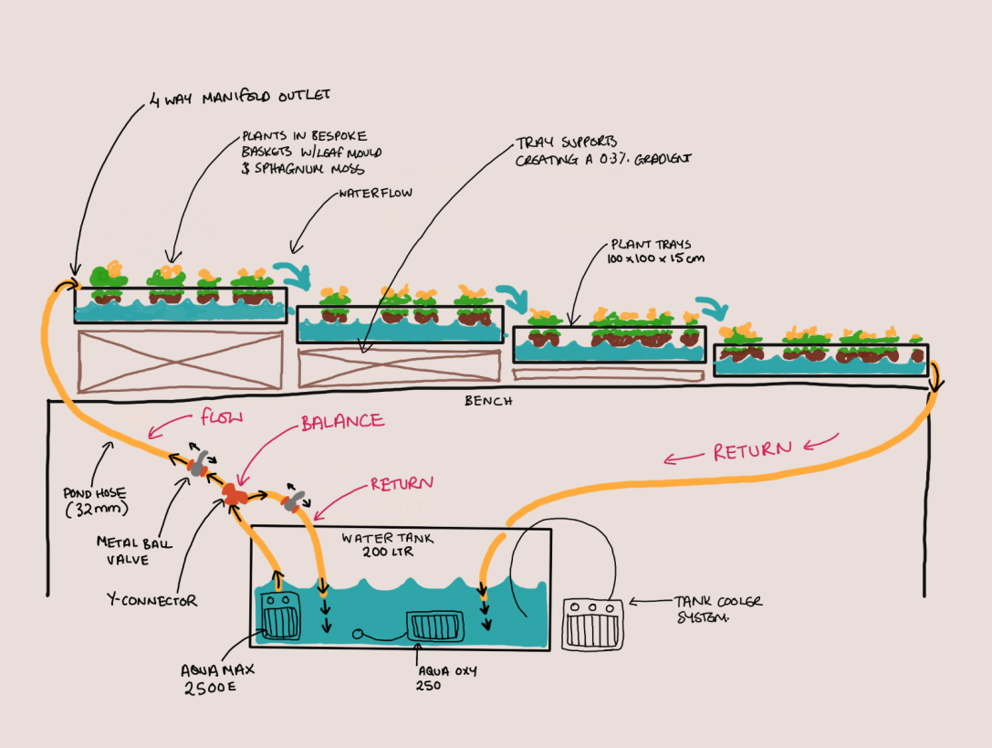 Keeping the water cool like the chilly streams in high-altitude sites was another challenge, especially with city summers and black trays soaking up the sun. We solved it with a hefty water chiller, circulating and cooling the water before sending it back through the system. The plants had to sit at just the right height above this chilled, moving water table the base of the rosette needed to be between 8 and 14 cm from the water surface. We made bespoke baskets for potting our plants into.