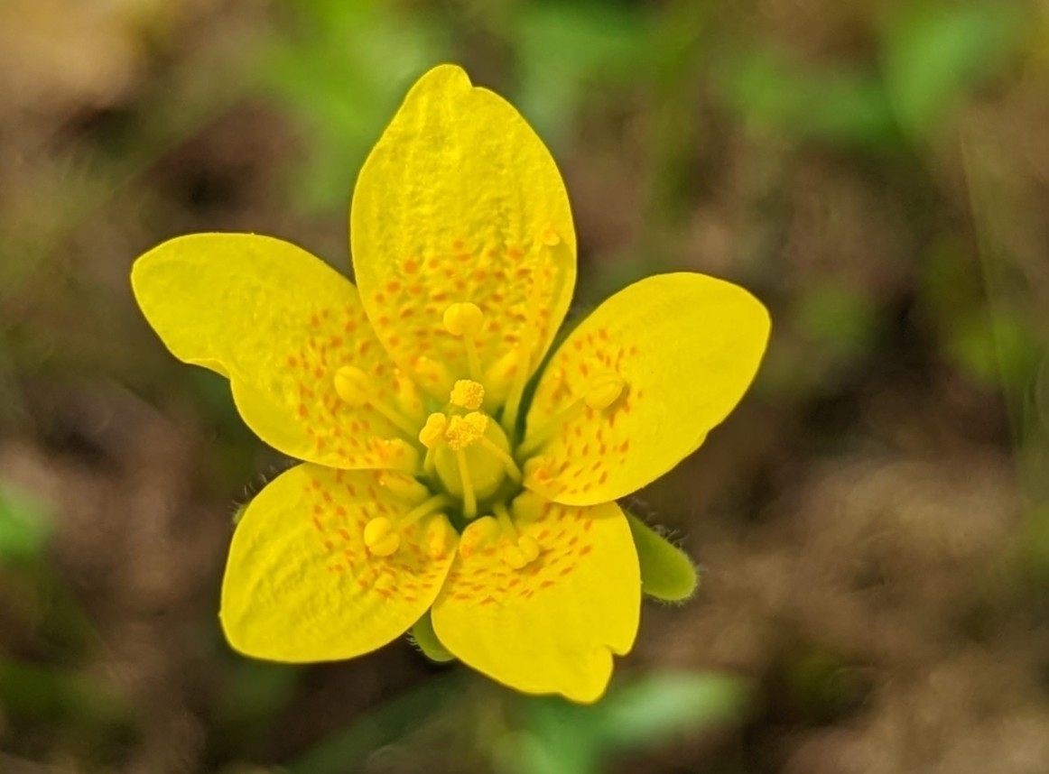 - Flowers: bright golden-yellow, usually 1–3 per stem (occasionally more), around 1–2 cm wide speckled with orange dots radiating from the centre.